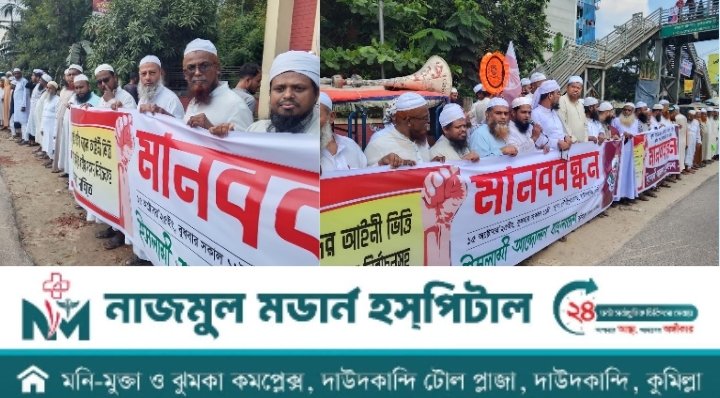 জাতীয় সনদের আইনি স্বীকৃতি এবং পিআর (Proportional Representation) পদ্ধতিতে নির্বাচনসহ পাঁচ দফা দাবি বাস্তবায়নের লক্ষ্যে ইসলামী আন্দোলন বাংলাদেশ কুমিল্লা পশ্চিম জেলা শাখার উদ্যোগে এক বর্ণাঢ্য মানববন্ধনের আয়োজন করা হয়।
